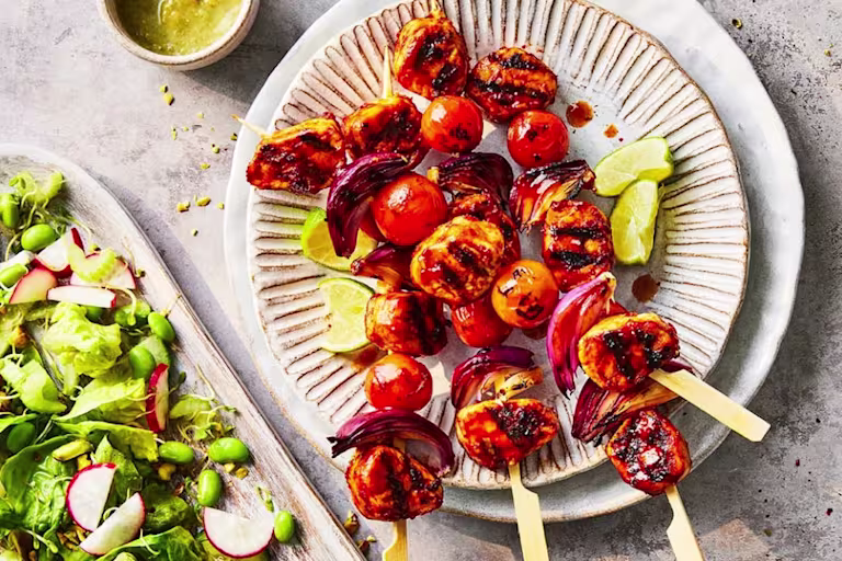 We love these Greek-inspired vegan chicken skewers with tzatziki sauce. Marinate the vegan chicken at home ahead of time and (or buy) the tzatziki sauce at home. Grill the skewers and flatbreads on site and you’ve a delicious campfire dinner!