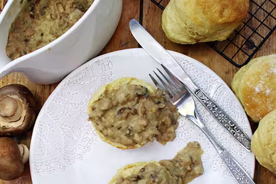 - Tear the biscuits in half and cover them with a generous serving of vegan sausage gravy poured on top.