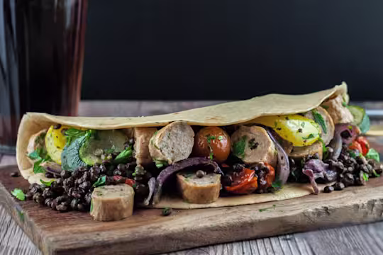 - Remove from oven, slice sausages and mix in lentils, vinegar, parsley and season.