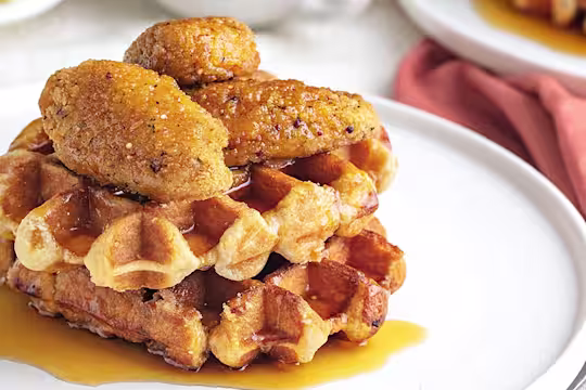 - Once cooked, top the waffles with baked Quorn Southern Fried Bites and drizzle with maple syrup!