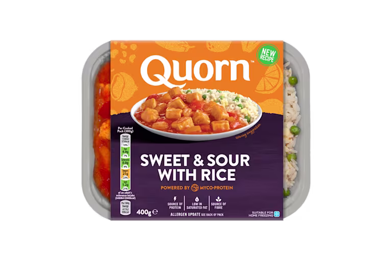 Sweet & Sour Sauce (61%) [Water, Quorn Pieces (21%) (Mycoprotein*, Rehydrated Free Range Egg White, Natural Flavouring, Firming Agents: Calcium Chloride, Calcium Acetate), Onions, Rice Vinegar, Red Peppers, Sugar, Carrots, Tomato Paste, Ginger Purée, Pineapple Juice from Concentrate, Pineapple, Cornflour, Rapeseed Oil, Salt, Colour: Paprika Extract], Cooked Egg Rice (39%) (Water, Long Grain Rice, Peas, Free Range Egg, Rapeseed Oil, Cornflour, Skimmed Milk Powder, Concentrated Lemon Juice, Salt, White Pepper). *12% of product.