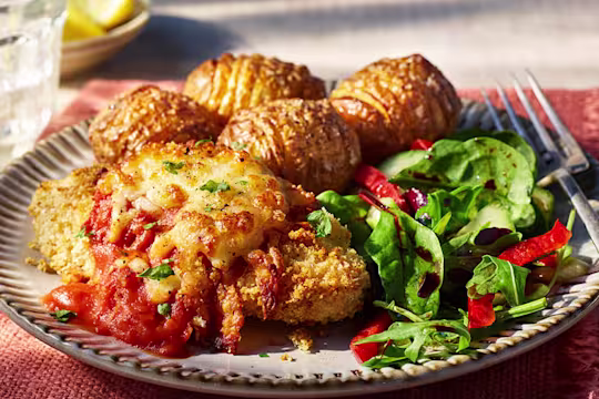 - Serve the salad with the Hasselback potatoes and Quorn Fillets Parmesan, garnished with fresh basil leaves.
