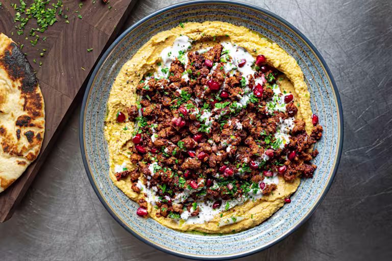 - Spread your warm hummus onto a serving plate, top with the crispy Quorn Mince and sumac onions.