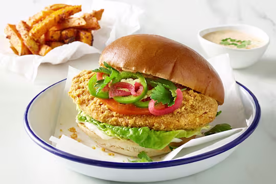 - To assemble the burgers, add a layer of the peri peri dip, then the lettuce and sliced tomato. Top with the crunchy fillet burger and drained onion and chilli pickle. Serve with the remaining dip and the sweet potato fries.