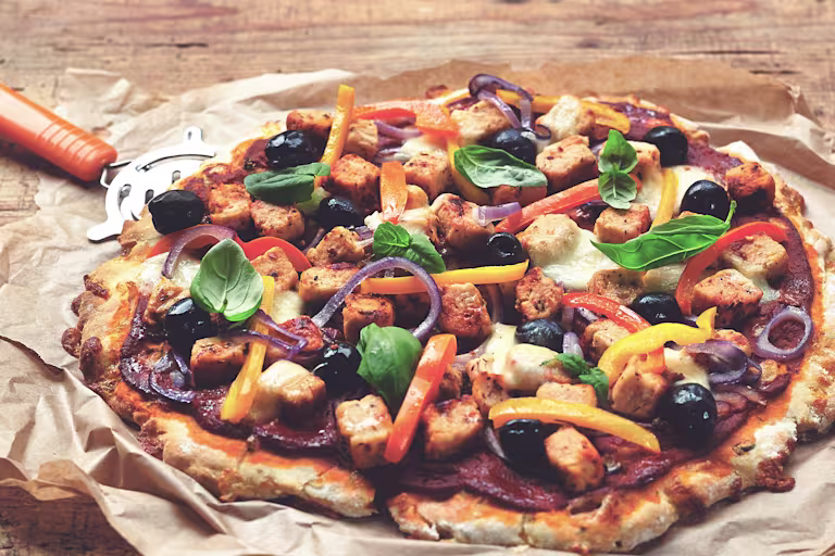 You won’t wait to bite into this appetising, flavoursome pizza topped with Quorn Pieces tossed in chilli flakes, oregano and garlic, and fried golden brown, and sharing the limelight with peppers and black olives, garlic and fresh basil. Gluten free and looking gorgeous. What could be more tempting?