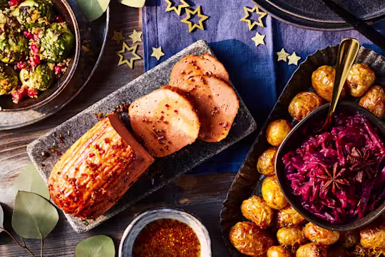 - Serve with the mulled red cabbage, hasselback sprouts and roast clementine baby potatoes and enjoy!
