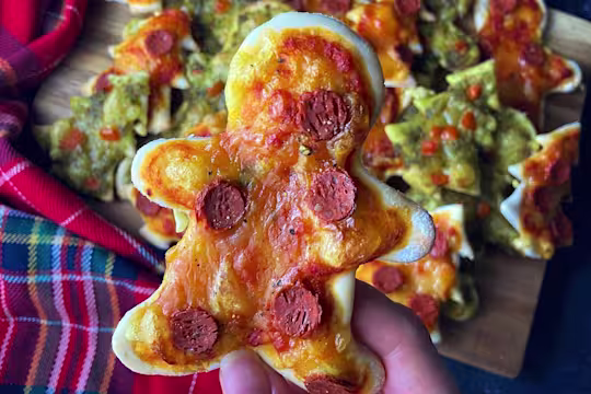 - Roll out the pre-made pizza dough onto a baking tray and press in the Christmas themed cookie cutters