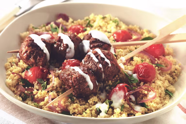 - Serve Meatballs, onions and tomatoes nestled on top of couscous, and drizzle with yogurt dressing