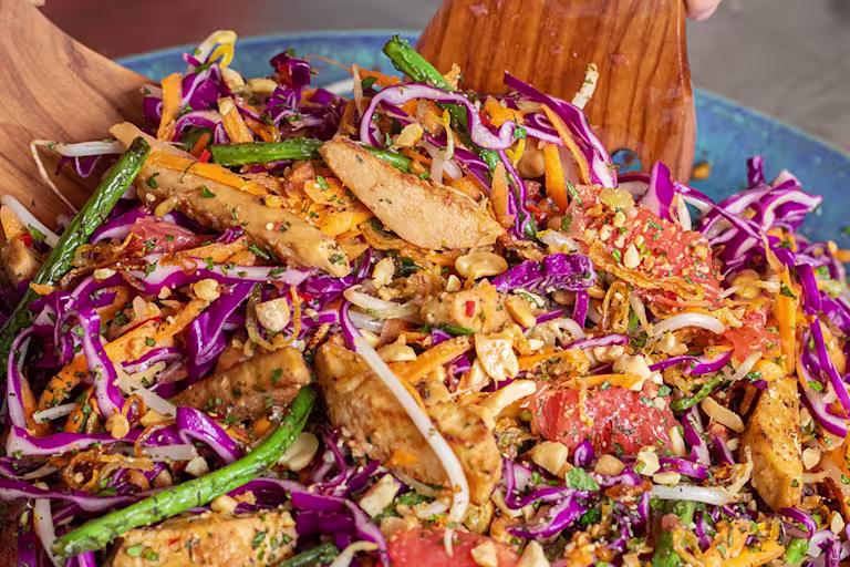 - Thinly slice the cabbage, finely chop the mint and grate the carrots. Cut off the ends of the grapefruit and slice off their skin. Cut along the lines of each segment to release the flesh in slices. Reserve the central part.