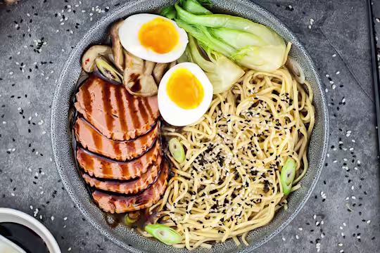 - Slice the Quorn Ham Roast into thin slices and cut the egg in half. Place over the top of the ramen, top with spring onions, sesame seeds and serve.