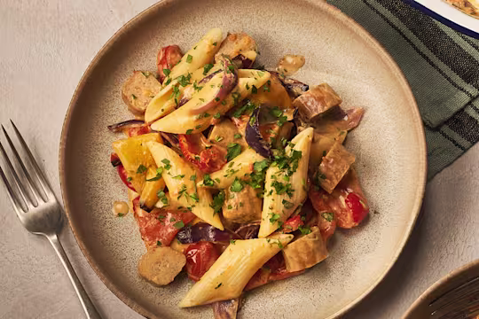 Start by cooking the pasta and roasting the Quorn Vegetarian Sausages before adding in your veggies until everything is charred and delicious. Slice the Sausages and add the stock, cream and red pesto and roast for a further 5 mins. Combine everything together, spoon into bowls and dig in!