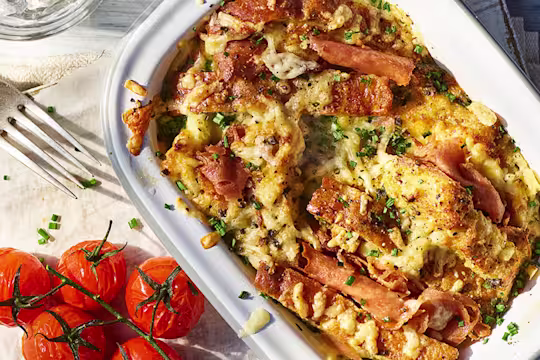 - Put the savoury bread and butter pudding in the air fryer and spray with a little oil spray and cook at 180 degrees C for 10-15 minutes until the egg is cooked through and the pudding is golden.