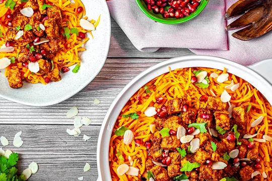 Try this healthy twist on a classic pasta spaghetti. Use spiralised strips of tasty Sweet Potato with delicious Quorn Pieces pan-fried in a spicy chraimeh marinade. Top with flaked almonds and pomegranate seeds, serve with fresh salad and enjoy as part of a fresh summery meal.