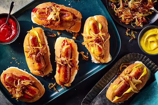 - Load up the hot dogs, with a generous bed of the fried onions followed by the sausages. Serve with mustard or ketchup.
