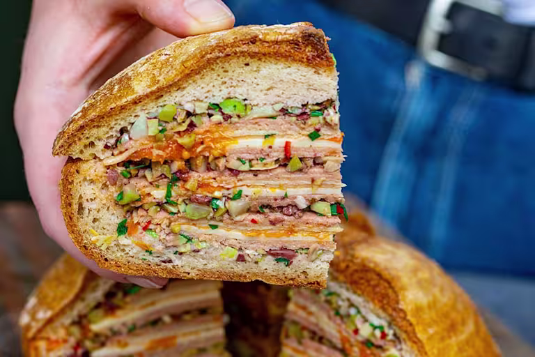 Cut the top off the bread and hollow it out using a sharp knife, then hollow out the lid — at this point you can make breadcrumbs or freeze it for future use. Add the lettuce in a thin layer along with a thin layer of olive mix, then add the cheese, a layer of tomato jam, then your Quorn Yorkshire Ham Style Slice, your Quorn Vegan Chicken Free Slice, and repeat until all of the ingredients are used up. Top with the bread lid and transfer to a baking tray, then place a weighted baking tray on the top and move into the fridge for 3 hours, or ideally overnight.