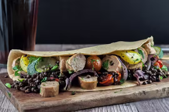 - Remove from oven, slice sausages and mix in lentils, vinegar, parsley and season.