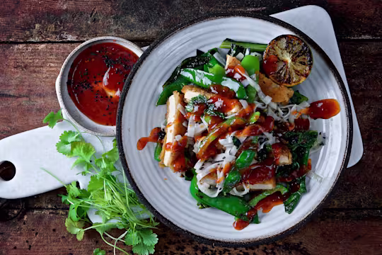 - Top cooked rice noodles with stir-fried vegetables. Top with the burger strips and sesame seeds. Serve with sweet chilli sauce and enjoy!